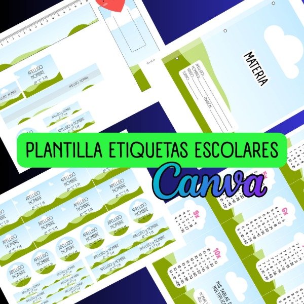 Kit digital de etiquetas escolares editables en Canva, ideal para personalizar y vender productos escolares terminados.