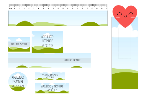 Incluye etiquetas para lápices, lapiceras y fibras (3 x 4,5 cm), etiqueta para forrar el lápiz completo (17 x 3 cm), etiquetas para cuadernos y libros (6,5 x 4,5 cm), etiquetas multiuso (4 cm circular, 6,2 x 1,5 cm y 7,1 x 2,2 cm), regla de 20 cm, regla de 15 cm, separadores para cuadernos con mes o materia y carpeta N°3, marcapáginas y tablas de multiplicar.